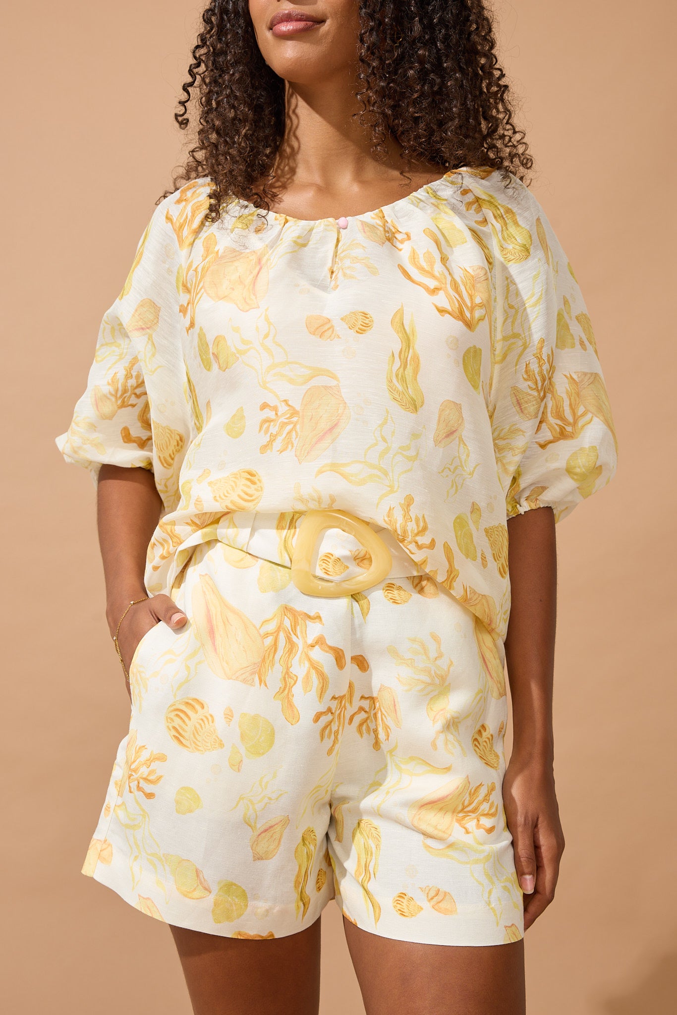 The Coral Shorts with adjustable belt are the perfect summer shorts. They have an elastic back and flat front, secured with a belt with a matching butter yellow buckle. A relaxed leg and finished with deep side pockets.