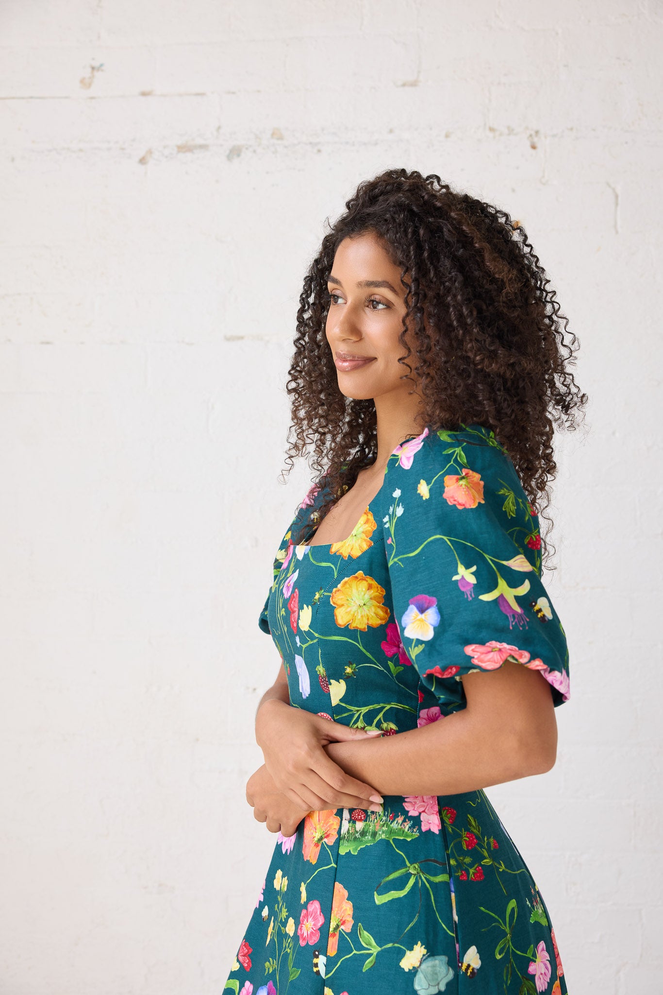The Lila Dreamscape Midi Dress is an elegant fitted tea length dress perfect for any occasion. Made in our forest green Dreamscape signature print, the Lila has panels creating a flattering fit from bust to waist. The dress has puffed sleeves finished with elastic, a slight v back and fastened with an invisible zipper. The square neckline provides comfort and support and is fully lined for a high end finish and of course, it has pockets!